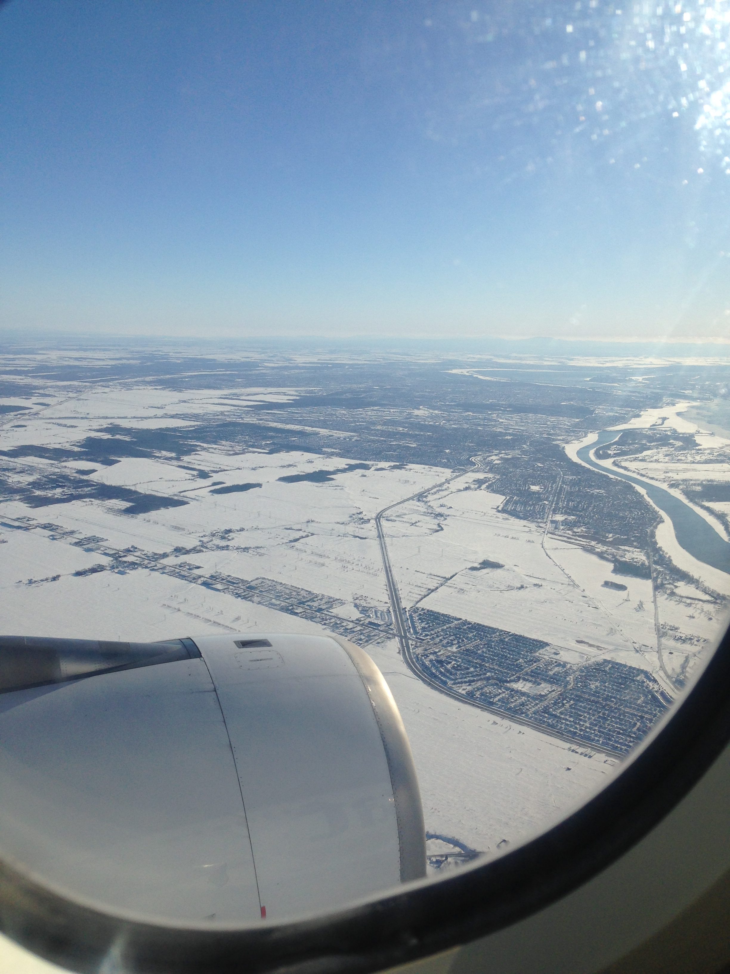 L’avion passe l’Atlantique et le sol tout blanc du Canada apparait au bout de l’aile. Quelques rivières gelées, puis le Saint Laurent, avec des « gros glaçons » dessus. Dernier virage, les tours (dont celle de KPMG) du centre-ville apparaissent dans le hublot, désarmement des toboggans, et hop, nous passons le portique chauffé, direction l’Immigration. Une longue file s’étend dans tout l’aéroport, c’est le moment critique.