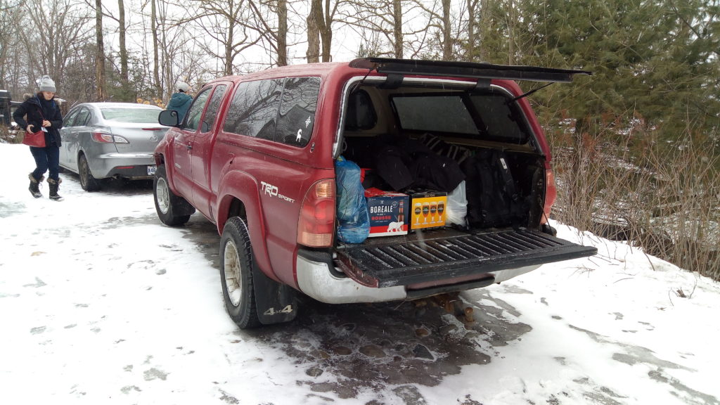 En France, les gros 4×4 ou pick-up semblent sur-dimensionnés. Toutefois, au Canada, c’est extrêmement pratique pour amener la bière au chalet ! Ce soir, après le repas mexicain (tacos et tortillas), nous avons prévu des jeux de société (un loup-garou pour ceux qui connaissent). Les canadiens m’expliquent également les principes du bière pong. Globalement, les règles sont simples: il faut lancer une balle de ping pong dans un verre pour faire boire le contenu du verre à son adversaire. Dans la pratique, c’est plus compliqué surtout après quelques verres dans le nez.