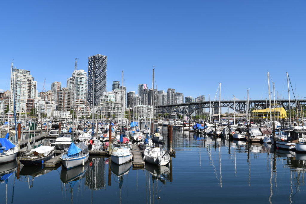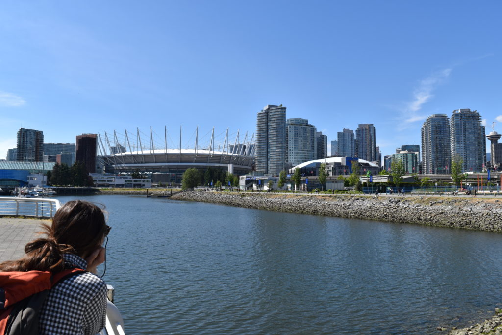 Pour moi, c’était la première fois que je voyais et mettais une main timide dans l’Océan Pacifique. Vancouver est le plus gros port canadien: ferrys et cargos côtoient les petits voiliers de plaisance et les kayaks. Comme à Montréal ou Toronto, les infrastructures industrielles sont intégrées à la ville. Il est très agréable de sentir la brise d’air salé sur le front de mer. Les nombreuses mouettes et goélands rappellent aussi que malgré les tours, nous sommes bien dans une ville côtière.