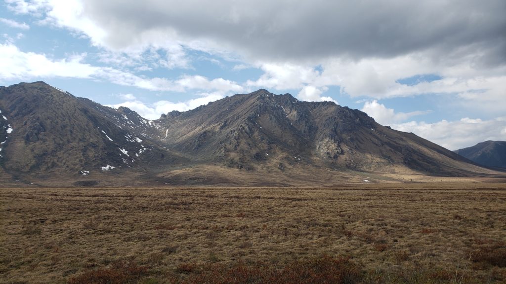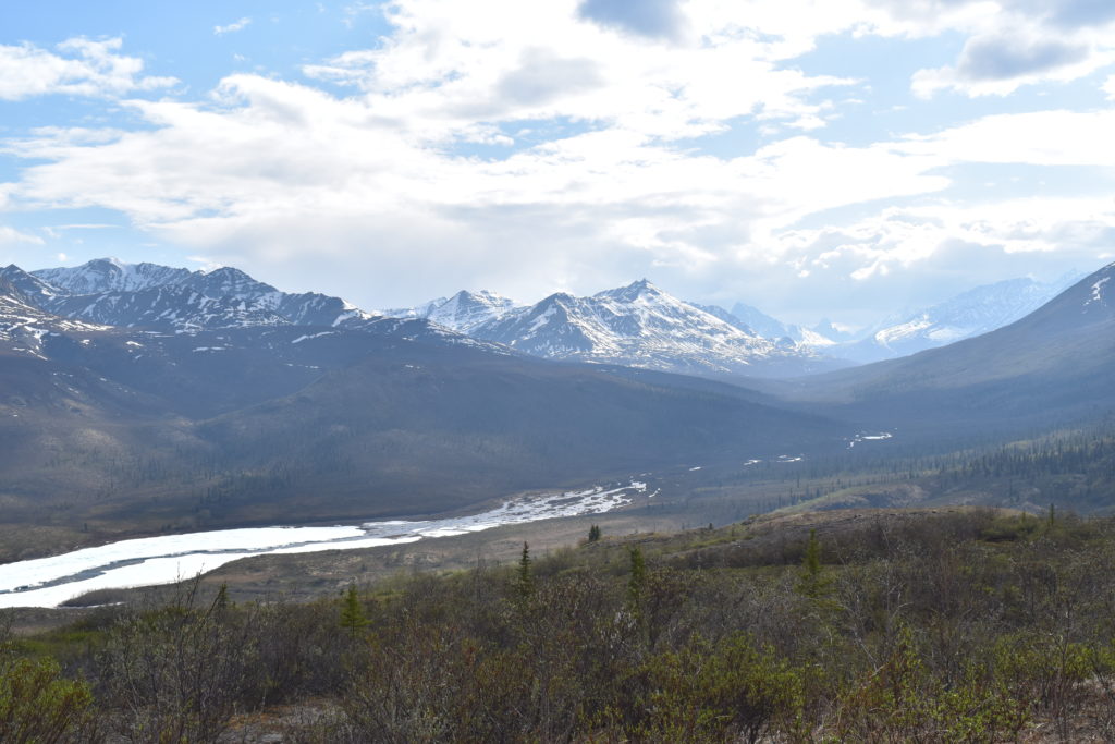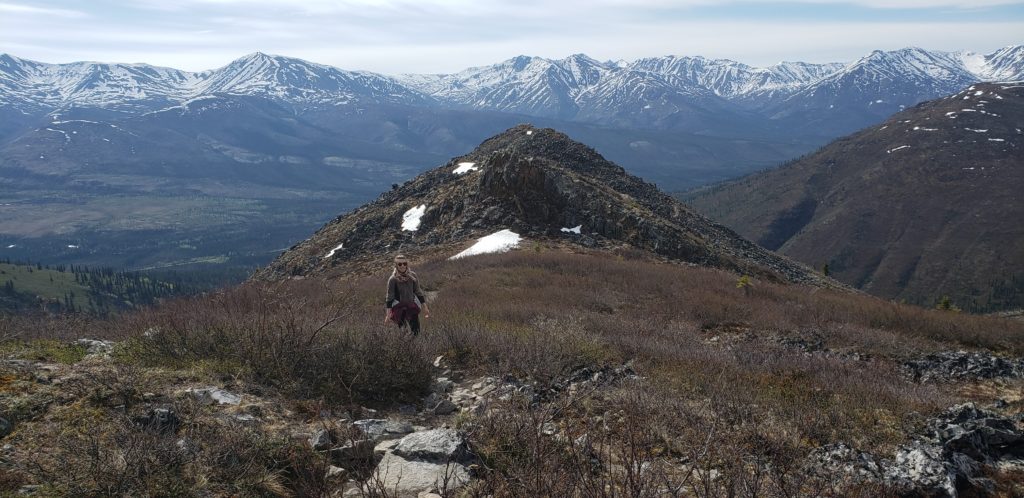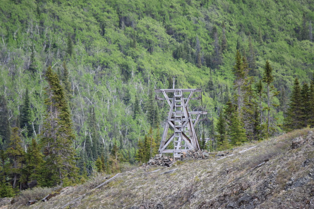 Le ventre bien plein, nous nous dirigeons vers le Sam McGee Trail, nommé selon un ancien prospecteur rendu célèbre par un poème (pour en savoir plus, en anglais par contre: https://whatsupyukon.com/Yukon-Lifestyle/history/the-real-sam-mcgee/ et le poème en question https://www.poetryfoundation.org/poems/45081/the-cremation-of-sam-mcgee). Le sentier suit une ancienne installation minière, une sorte de télésiège pour wagonnet d’or. Les installations datent de plus d’un siècle et sont pourtant toujours plus ou moins debout. C’est un miracle d’avoir tout cela en bon état malgré les hivers et l’absence totale de maintenance. Nous devons faire attention aux éventuelles chèvres arctiques qui mettent bas pendant cette période.
