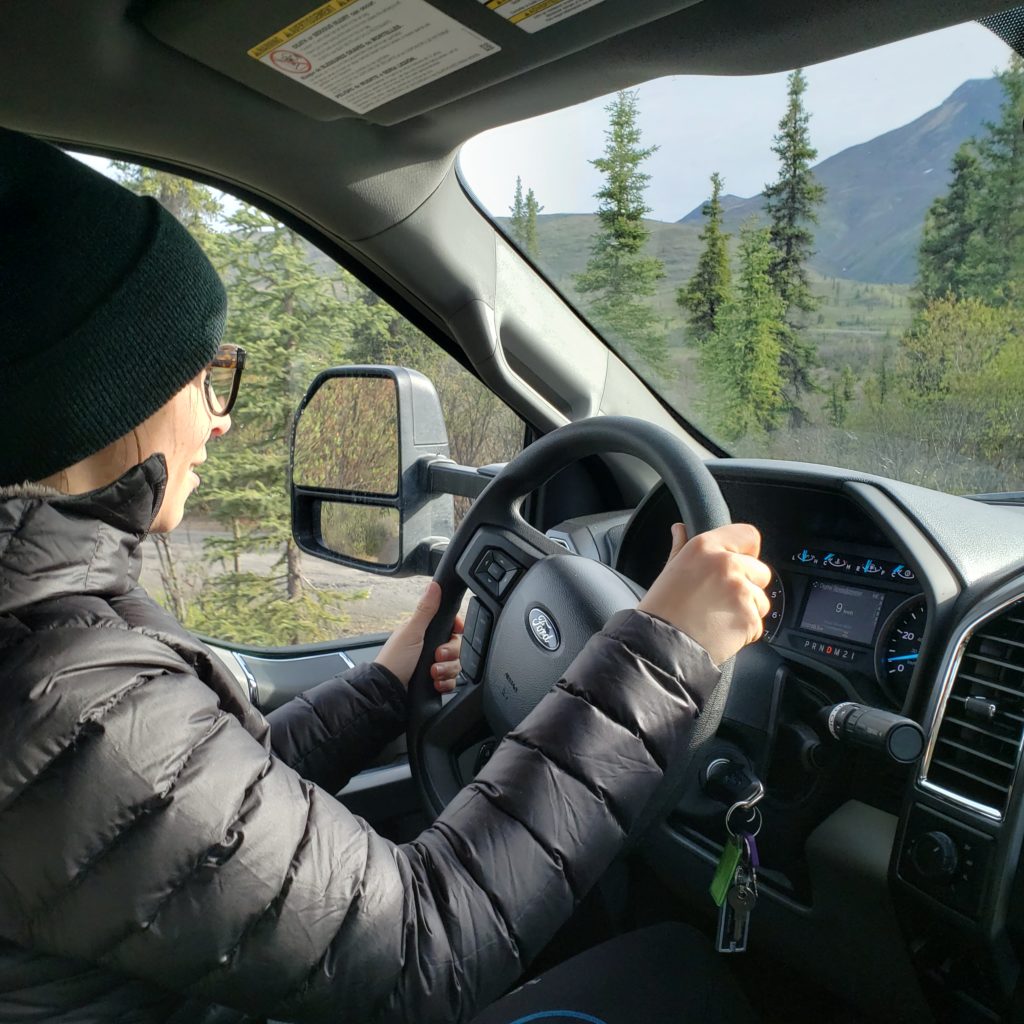 Impossible d’aller plus vite que 60 km/h sans faire tanguer dangereusement le van. Nous ne souhaitons de toute façon pas être rapide, pour pouvoir s’arrêter observer le paysage. L’endroit où nous faisons une halte se situe à l’exacte limite entre les forêts nordiques primitives et la taïga. La terre est couverte par des herbes hautes aux racines et aux tiges solides, aux couleurs rouge, orangée. Il n’y a plus d’arbre feuillu ni de pin. À la maison du parc de Tombstone, on nous indique que le paysage n’a pas changé depuis la dernière ère glaciaire il y a 100 000 ans.