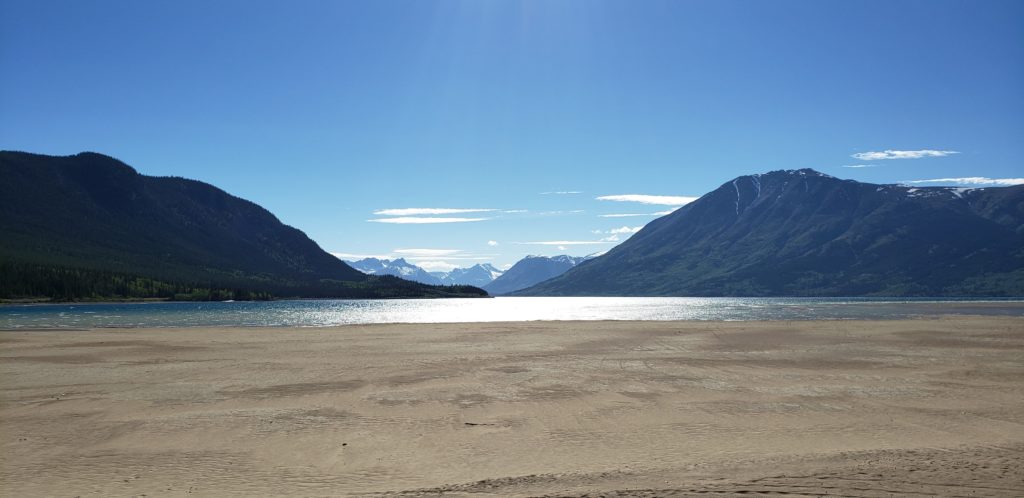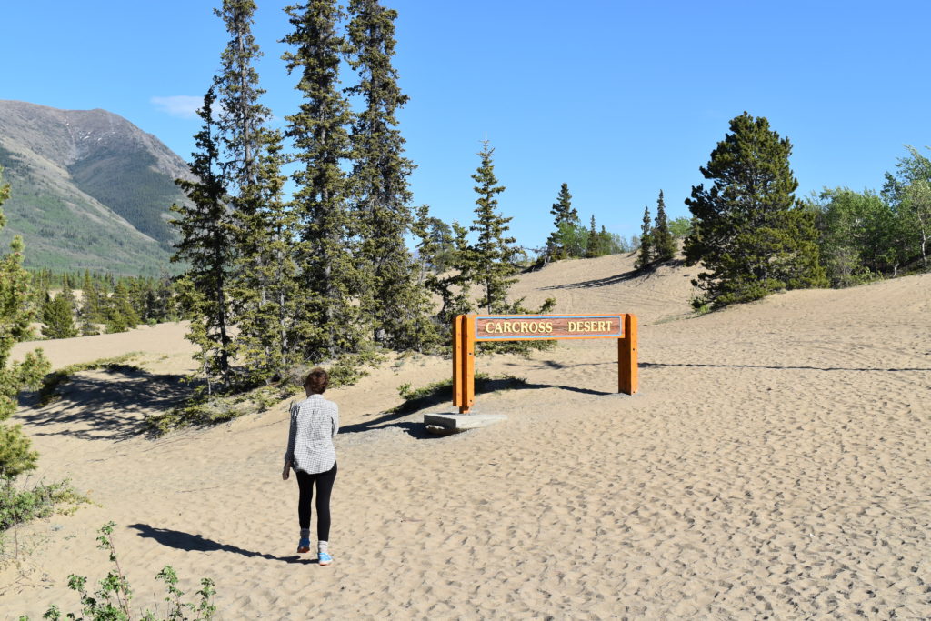 Tout contents de notre rencontre, nous nous dirigeons vers le Caribou Crossing Trade Post, un élevage de huskis et de malamuts (une espèce de huski sous stéroïdes). Le lieu abrite également un musée en l’honneur de la police montée du Canada, qui fera sans doute l’objet d’un article dédié, tellement les histoires relatées étaient invraisemblables. Le clou du spectacle était sans nulle doute la nurserie de chiots. Même si elle ne veut pas l’avouer, Judith a adoré se faire attraper et mordiller par une demie douzaine de bébés malamuts. Nous stationnons ensuite notre van dans la ville de Carcross, qui bénéficie d’un lac et d’une plage de sable fin, issu de l’érosion et de la fonte des glaciers. Ce sable, poussé par le vent, a également donné naissance au plus petit désert du monde (on les croit sur parole).