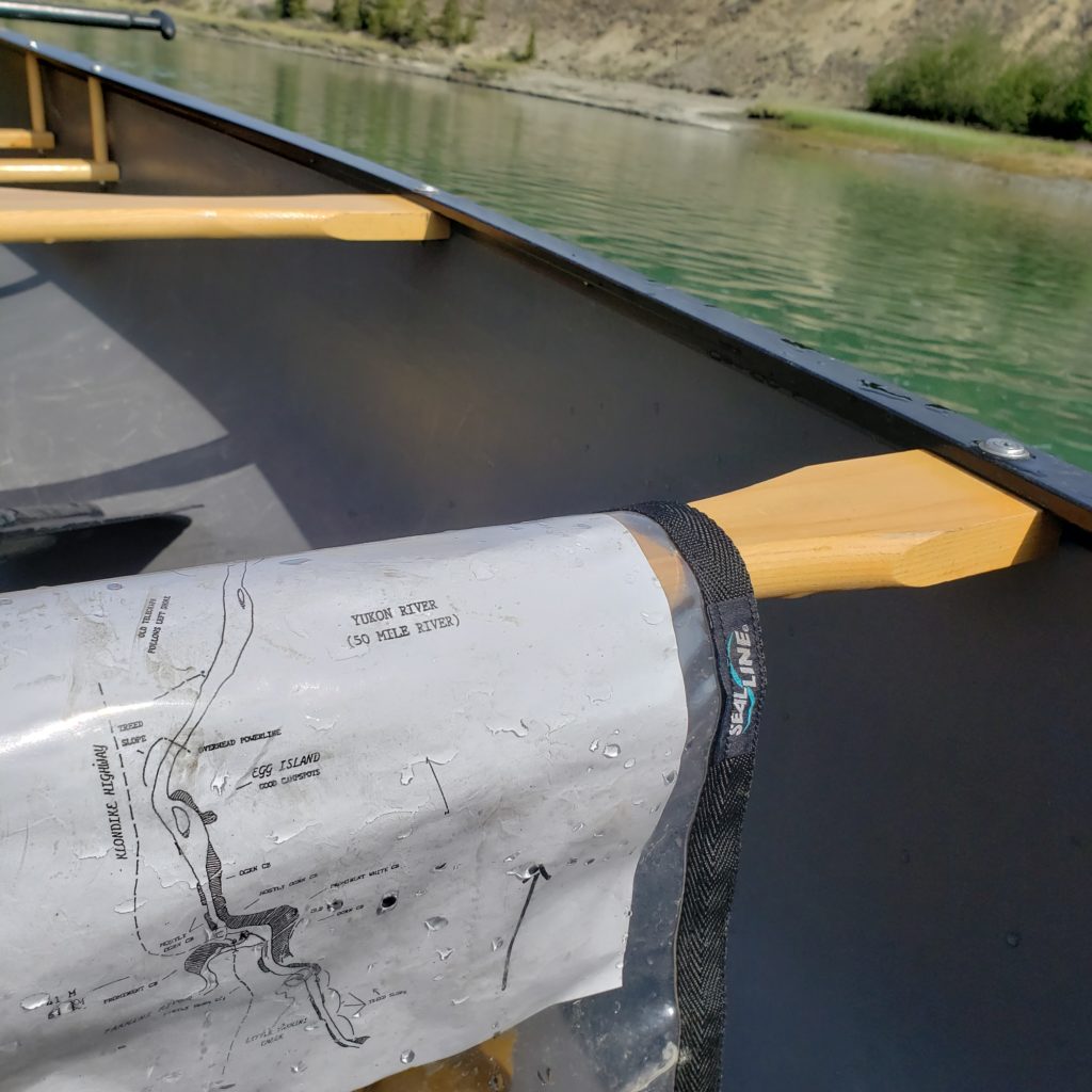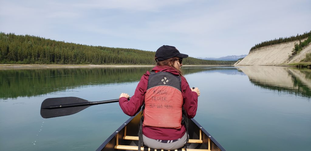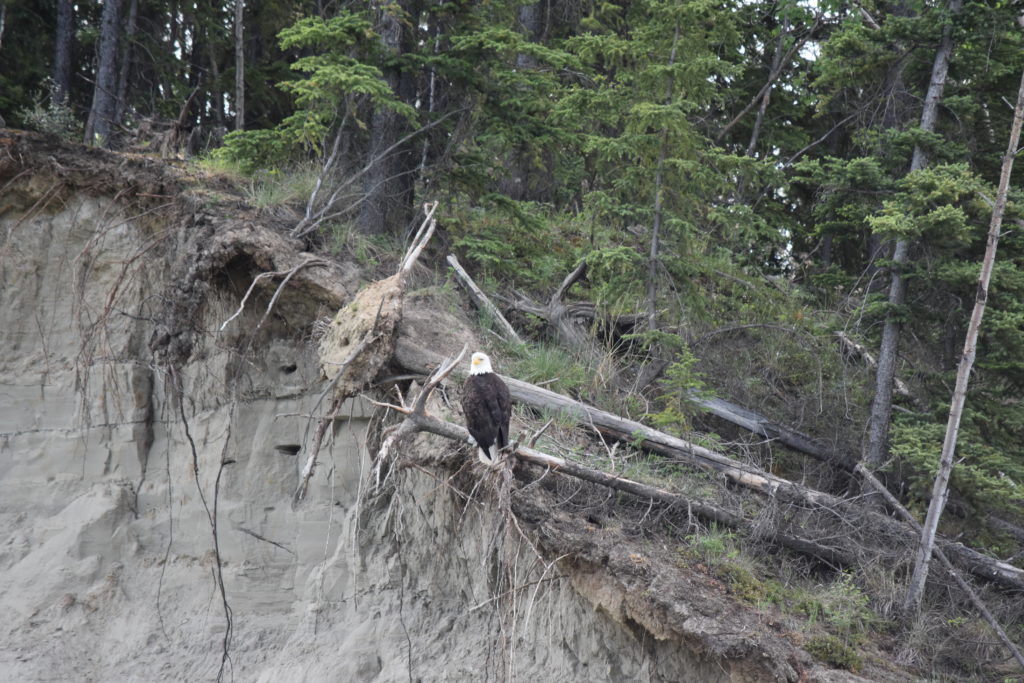 Comme à chaque fois que je vois de l’eau, je pense kayak ou autres joies nautiques, il fallait bien que Judith accepte de partir à l’aventure sur la rivière Yukon en canoë. Dès les premiers coups de pagaies, nous croisons nos premiers compagnons de traversée. Un castor un peu déboussolé passe devant l’embarcation et frappe la surface de l’eau d’un grand coup de queue pour plonger. Un peu plus loin, à flanc de falaise, nichent un très grand nombre d’hirondelles, qui ici aussi, font le printemps.
