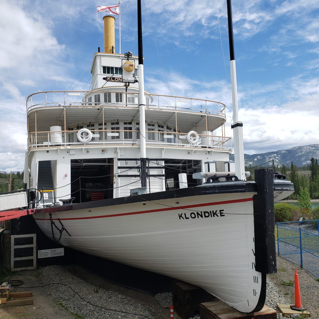 Nous voici donc dans notre chambre d’hôtel assez impersonnelle, après 12 jours passés dans notre bien aimé van. Nous avons adoré l’expérience, et sommes prêts pour une expérience plus intense, avec simplement une voiture et une tente. Notre visite de la ville s’achève sur le SS Klondike, un immense navire à vapeur, dont la roue à aube se situe à l’arrière. Il reliait Dawson (en deux jours) et Whitehorse (en 6 jours à contre courant au retour) entre 1925 et 1950 quand les militaires ont terminé l’autoroute.