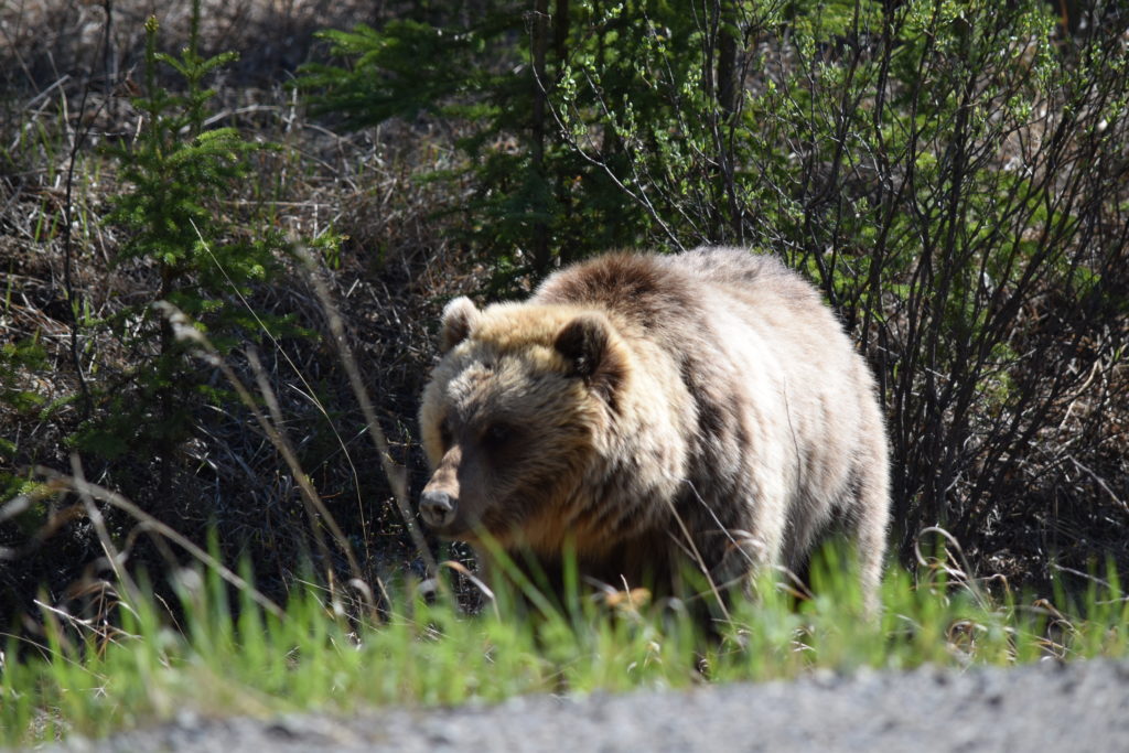 Malheureusement, nous ne pourrons en voir, car il fait maintenant trop chaud. Ils ont migré vers des terres plus froides au nord. Au détour d’un virage, je saute sur le frein. Là, à vingt mètres, de l’autre côté de la route, un grizzli ! Énorme et poilu, il fouille le bas-côté à la recherche de nourriture. Il lève une tête peu aimable vers la voiture, et visiblement peu intéressé, continue son repas.