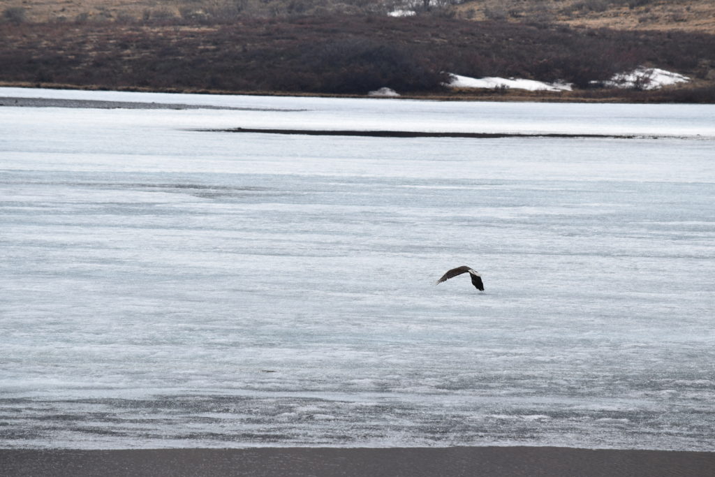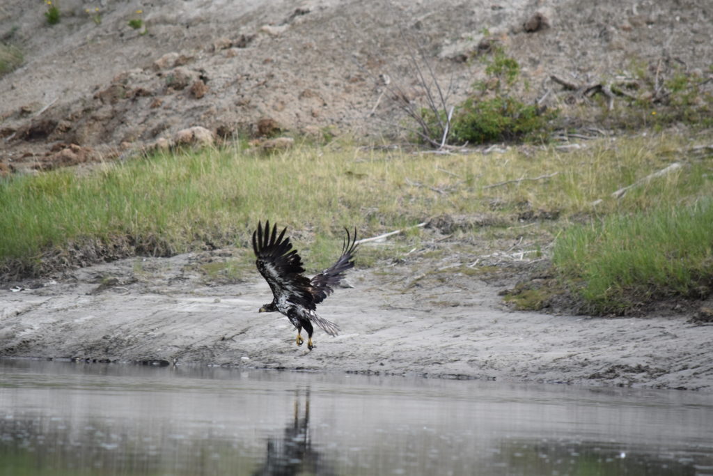 Nous ne croiserons personne sur la rivière, mais nous sommes entourés de très gros corbeaux (ravens), très criards, cherchant des poissons à pêcher. D’ailleurs, la surface de la rivière est perturbée par des groupes de saumons qui remontent le courant.