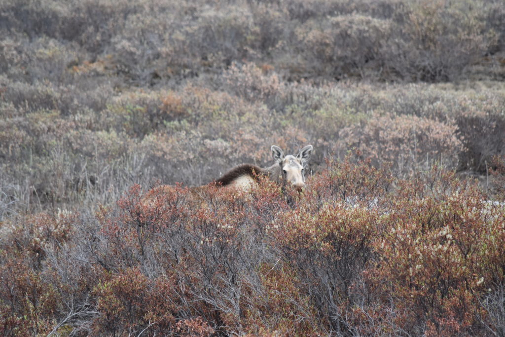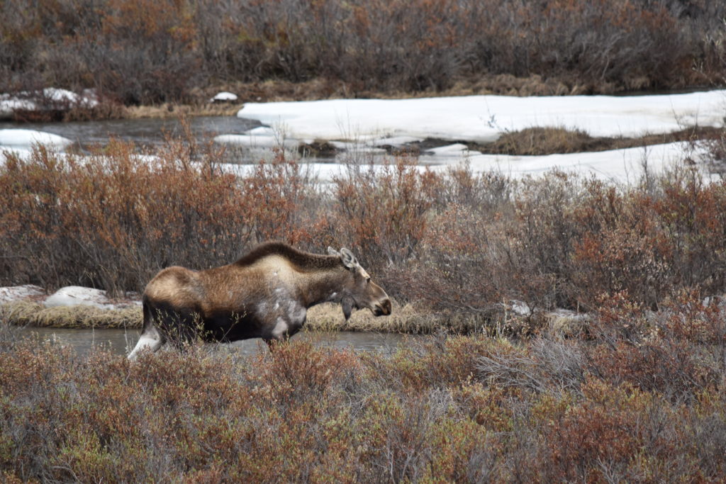 Faute de carburant, nous ne pourrons continuer jusqu’à la ligne symbolique du cercle arctique. Et oui, le van consomme près de 20 litres au cent. Faire le plein demande 200 litres d’essence ordinaire, pour un coût de 275 dollars, dans les stations bon marché. Sur le chemin du retour, nous croisons un élan qui nous fuit rapidement dans les herbes hautes. Un peu plus loin, nous coupons le contact et attendons quelques minutes. Nous sommes récompensés, l’élan réapparait d’un pas nonchalant. Ses grandes jambes fines disproportionnées semblent bien fragiles sous ce gros corps, mais ne jugeons pas. Il relève la tête, méfiant. Nous croisons une famille Première Nation qui s’arrête également au niveau de la bête.