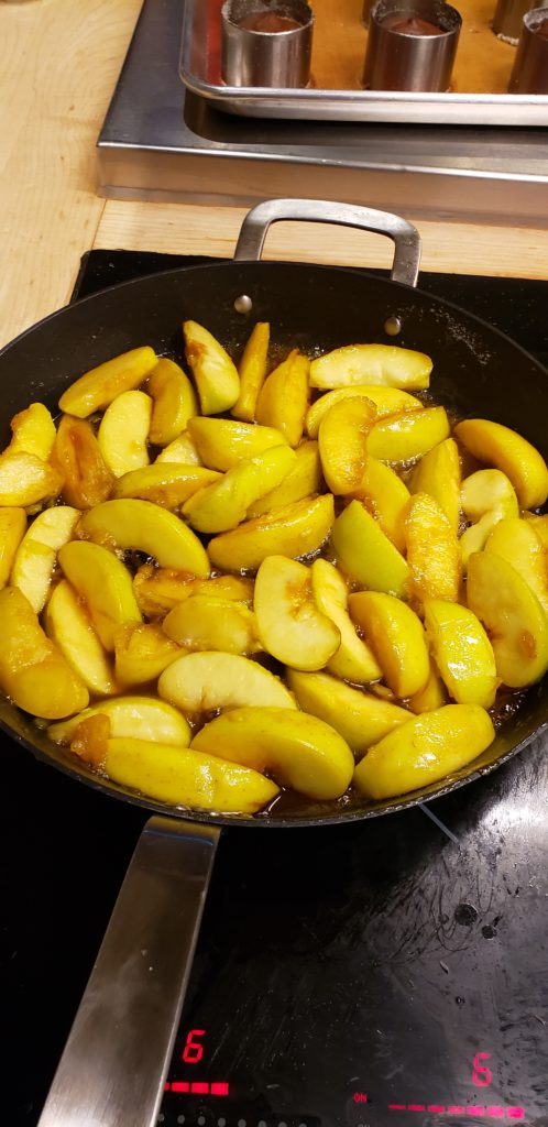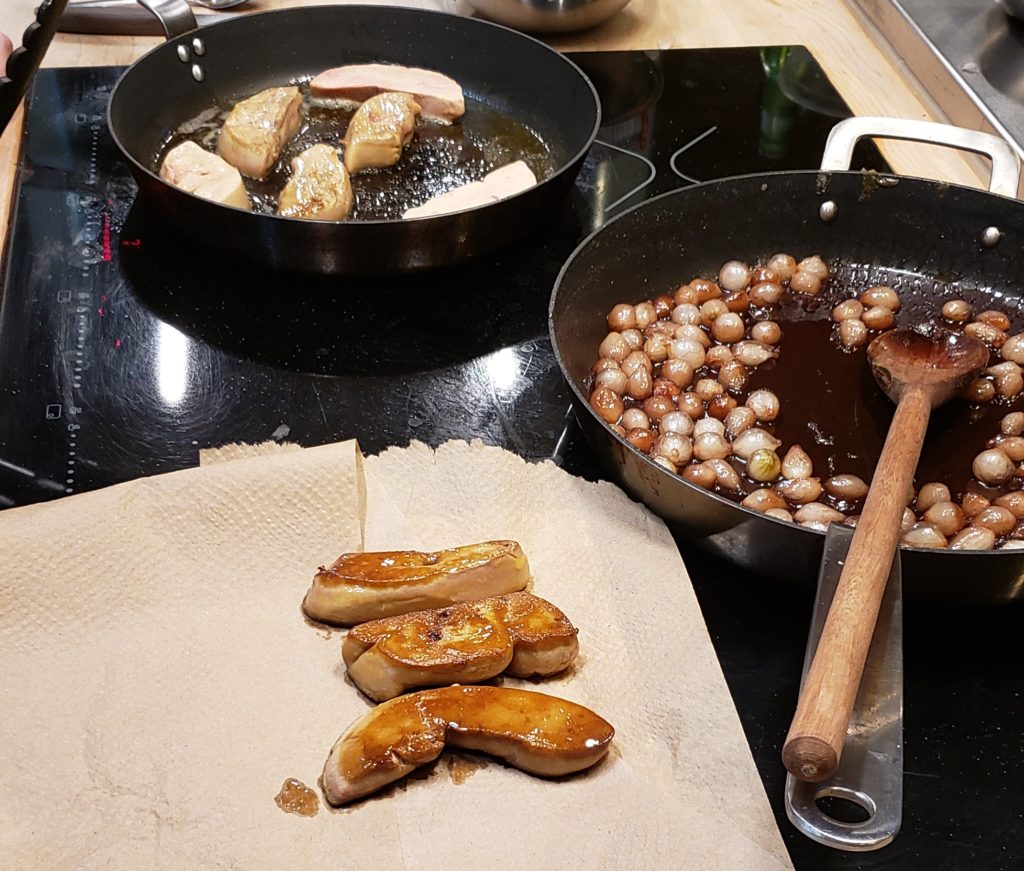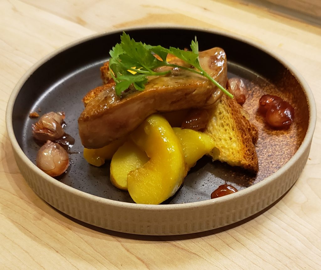 – Escalope mi-cuite de foie gras avec toast, pomme caramélisée au cidre et petits oignons blancs revenus au vin rouge