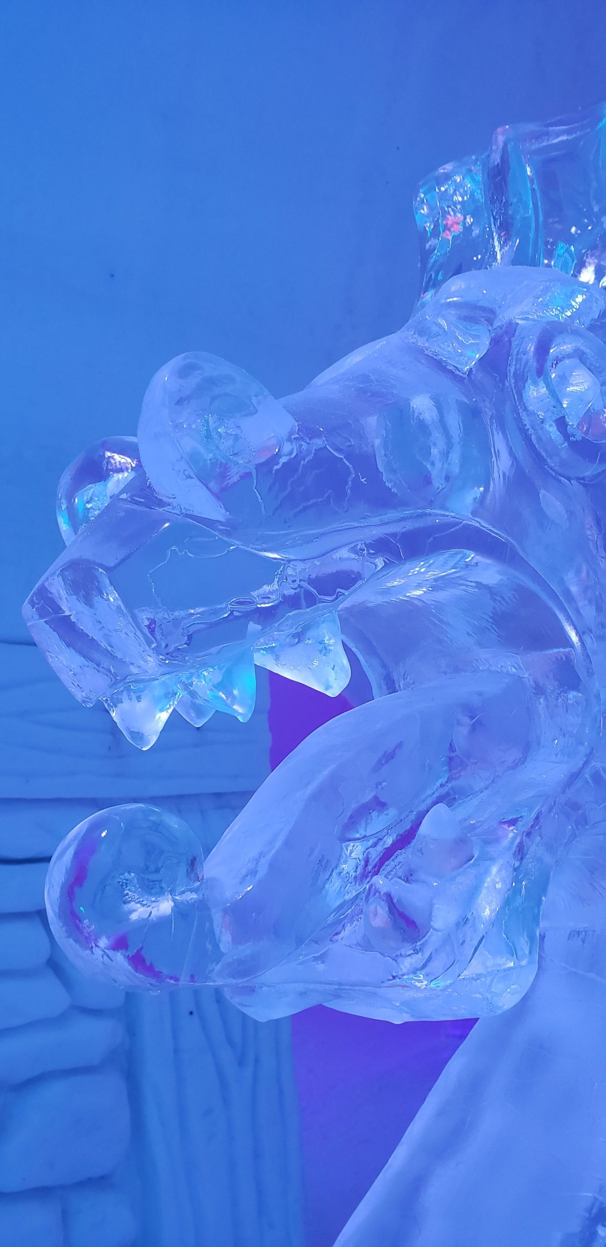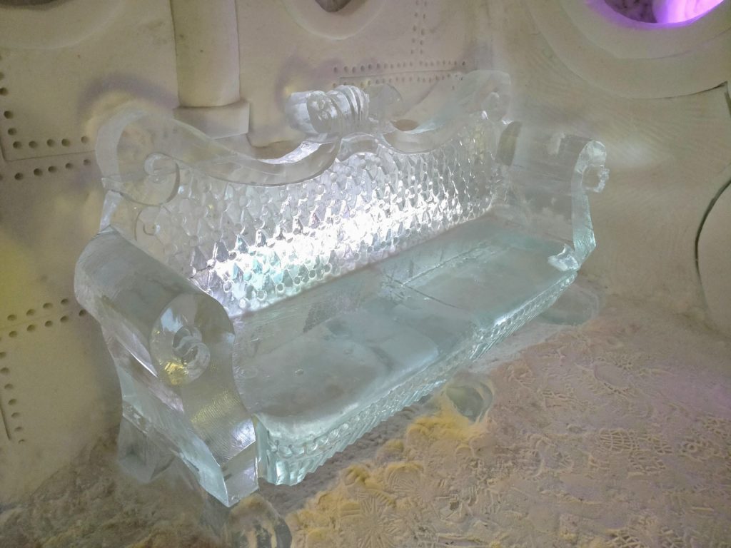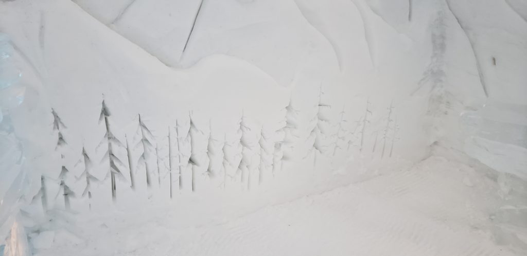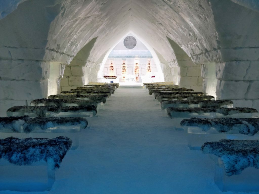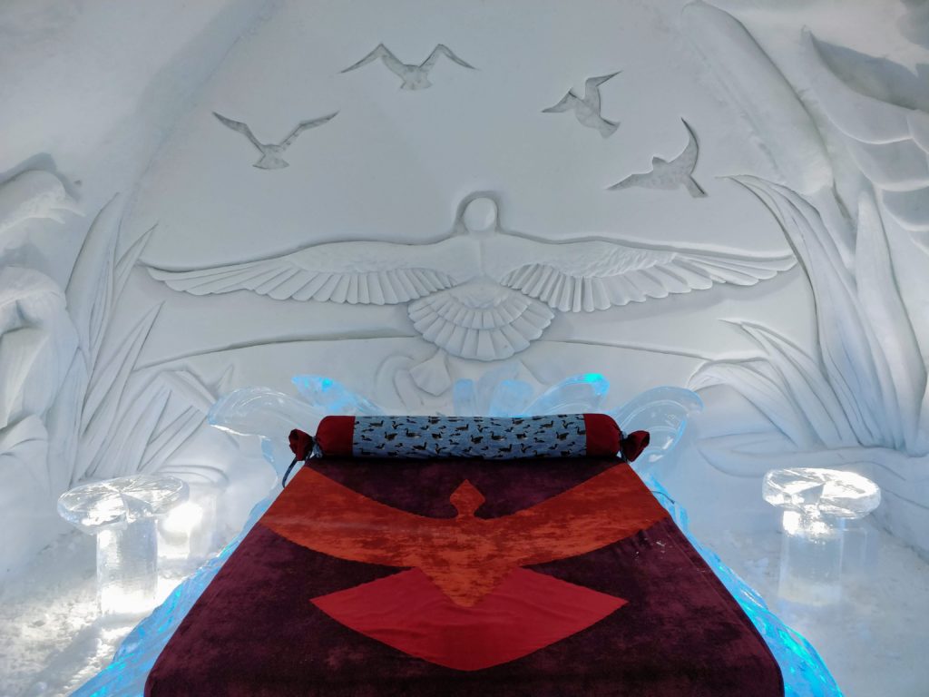 42 jours pour construire l’hôtel, habitat éphémère, voué à fondre lentement au printemps. Des artistes viennent personnaliser chaque chambre en sculptant la glace et la neige. Le bar sert ses cocktails dans des blocs de glace. C’est une plongée assez incroyable, la structure est suffisamment résistante pour abriter des foyers garantissant une température intérieure entre +3° et -3°C quel que soit le temps dehors …