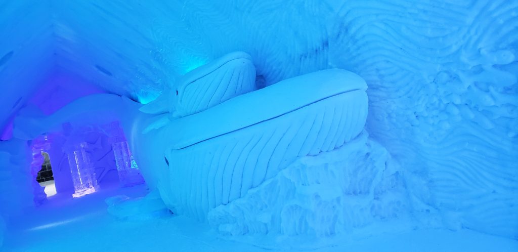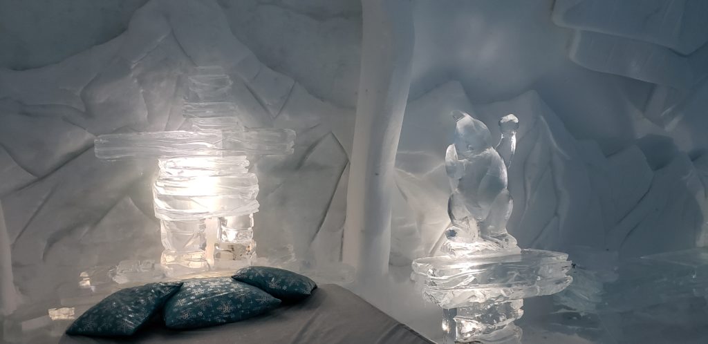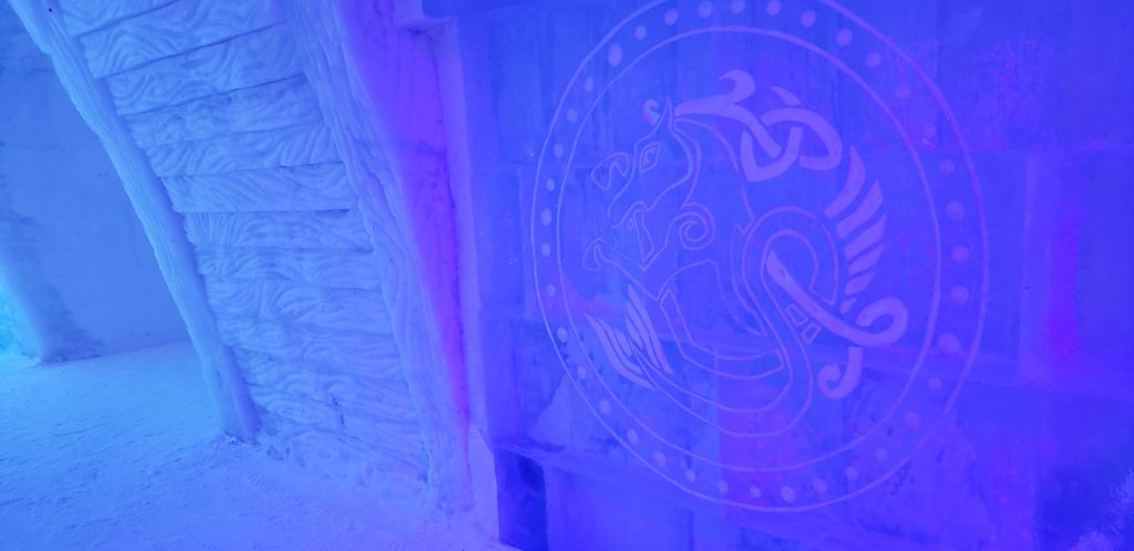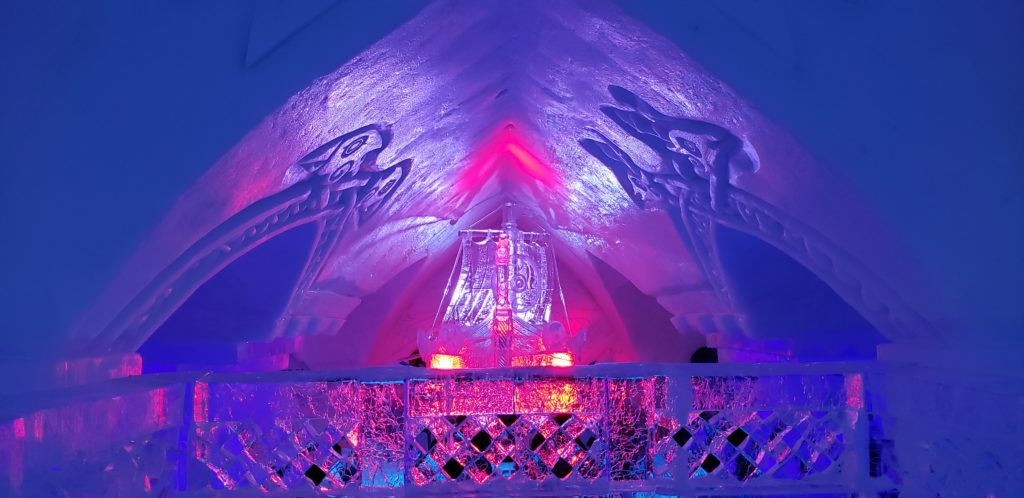 Cette année, le thème est « Viking ». Il est possible d’assister à l’office dans la chapelle de glace. Parce que, pourquoi pas. Sinon, vous pouvez rejoindre directement le bar, ou le grand hall d’accueil. On vous laisse découvrir tout ça en image. Nous n’avons pas dormi là bas (même si c’est possible de réserver une chambre et dormir dans l’hôtel) mais nous avons pu faire une visite complète des lieux.
