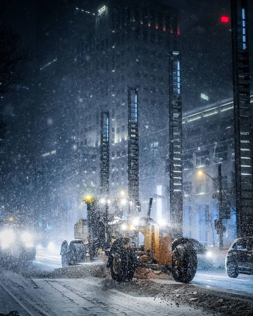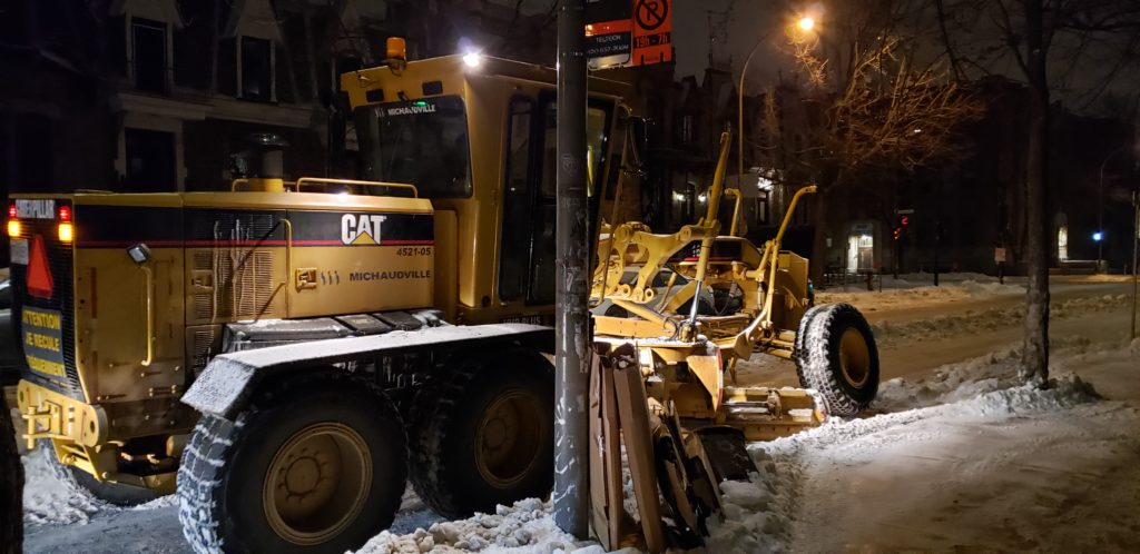 Le processus est simple et bien aidé par la technologie. On reçoit, via une application de la ville, une alerte sur notre smartphone nous prévenant de l’opération de ramassage. Il faut déplacer la voiture dans les temps. À l’heure dite, on entend le camion de la police avec sa sirène, indiquant qu’il faut vite enlever sa voiture sous peine de se la faire enlever manu militari. Ensuite, des niveleuses raclent la neige. Elles forment des congères taille Canada. Des camions vides se positionnent le long pendant qu’un tracteur broie puis éjecte la neige dans le camion, comme le ferait une moissonneuse-batteuse avec le blé. Encore une fois, c’est rudement efficace. On en oublierai presque le petit tracteur qui fait la finition.