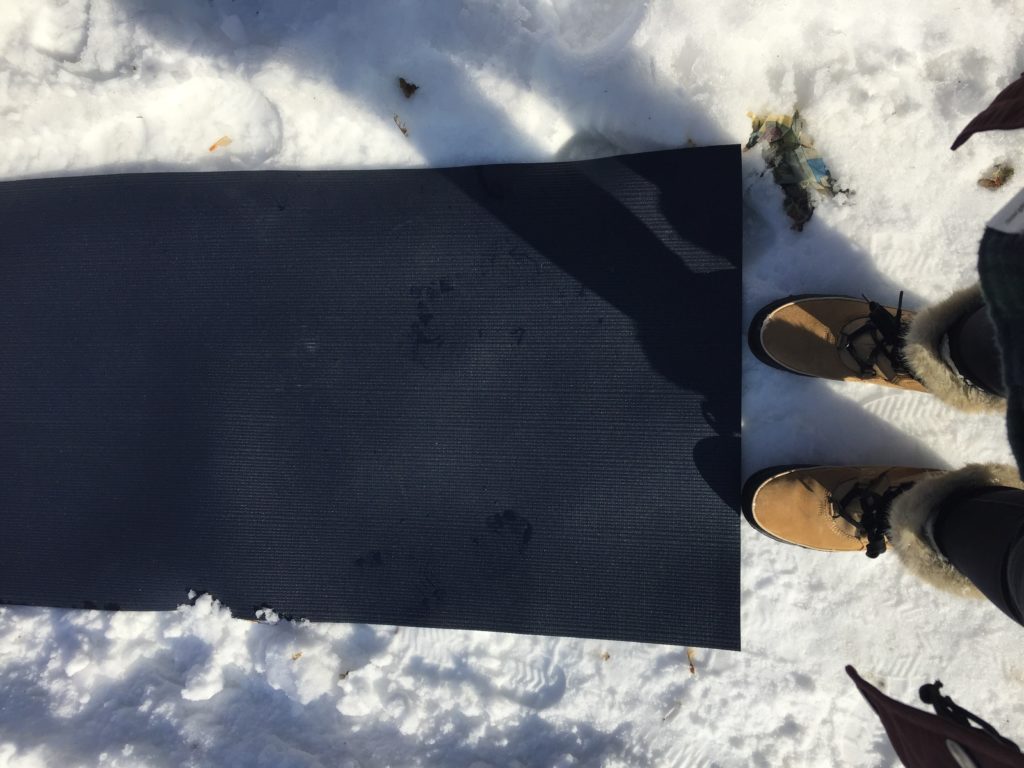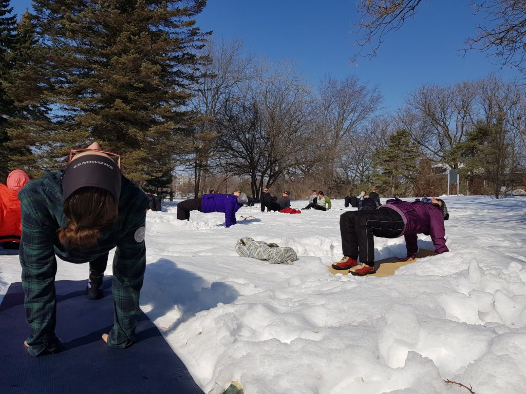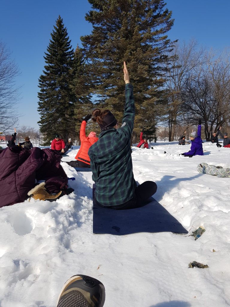 Arrivée au parc, une cinquantaine de personnes sont déjà installée. Je trouve une zone libre et tasse la neige pour poser mon tapis. Et oui, au milieu du parc, les 40 centimètres de neige ne sont pas tassés!