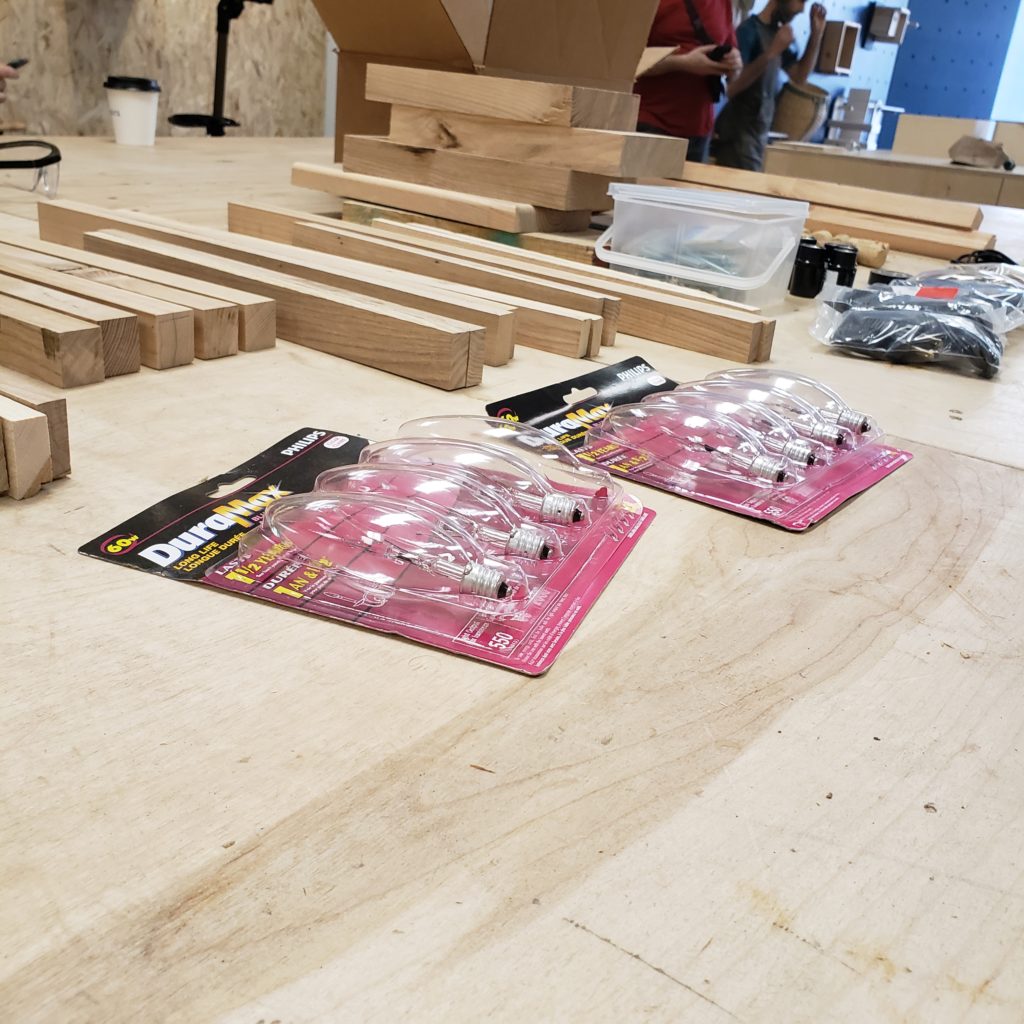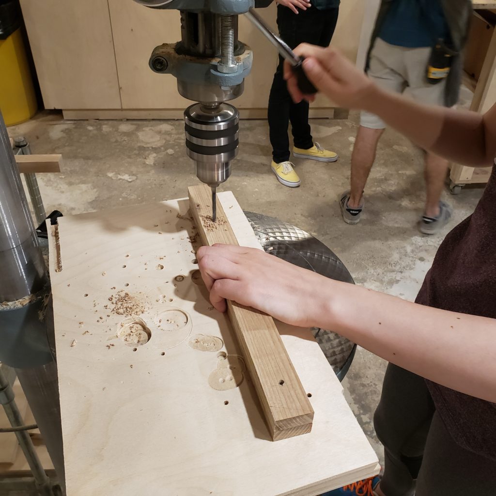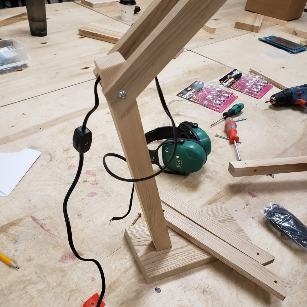 L’instructeur nous présente le matériel: du frêne, un câble électrique, trois vis une douille et une ampoule. On nous présente les machines pour découper, percer, aplanir et poncer.