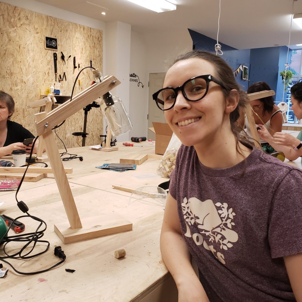 Pose de la fierté. Les plus observateurs remarqueront que Judith a construit une lampe avec du verre translucide et que la mienne est d’un beau vert bouteille.