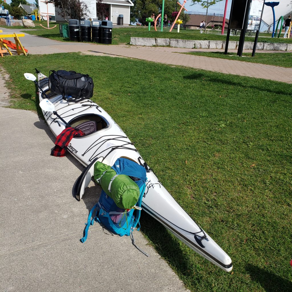 Tout rentre en tassant bien. Pour une fois, nous n’allons pas prendre trop et nous contenter de l’essentiel: un bouquin de mille pages, du papier toilette et une recharge de batterie de téléphone. En effet, le téléphone nous servira de GPS une fois sur l’eau. Et une petite catastrophe, les salades avec la sauce n’ont pas aimé la compression. On aura donc des t-shirts odeur soja / arachide. Nous sommes toutefois fins prêts pour rejoindre la marina de Gananoque.