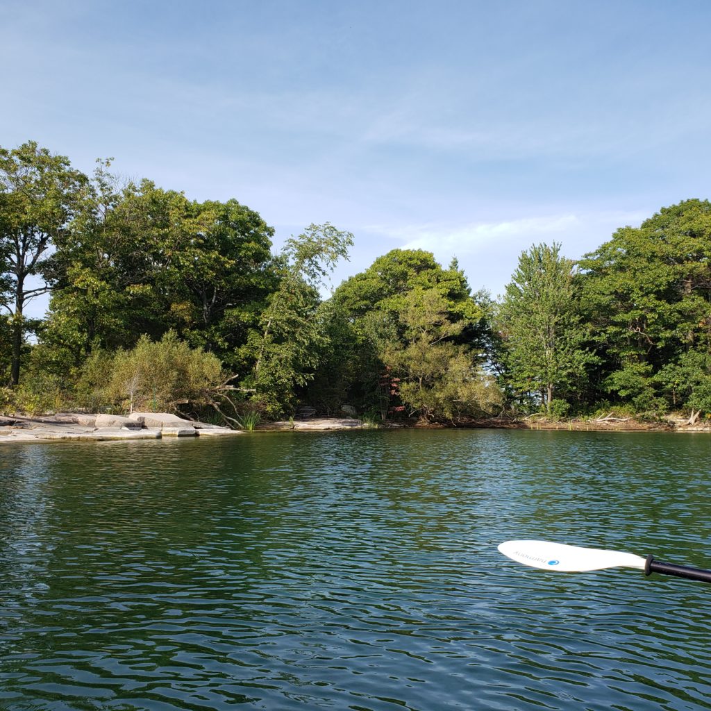 Nous traversons rapidement le chenal de navigation ouvert aux bateaux à moteurs et aux Seadoo. Le temps est au beau, et nous n’avons qu’à éviter le sillage mouvant des plus grosses embarcations. Rapidement, nous nous retrouvons au milieu des îles dans des eaux très calmes. Le capitaine Judith nous guide à merveille parmi les îles et îlots.