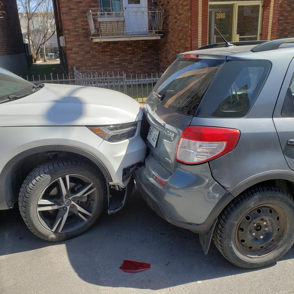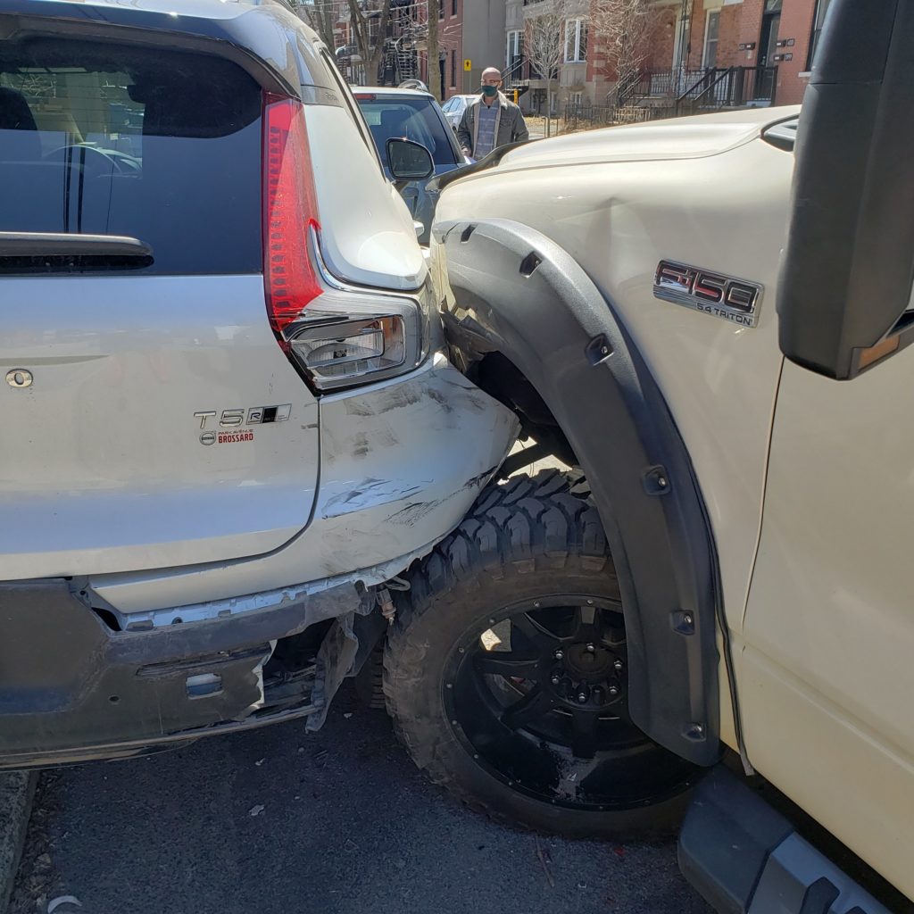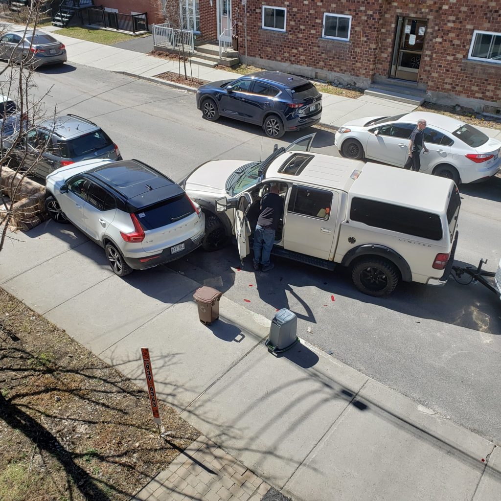 C’est le fait divers du mois. Il est possible de se faire exploser sa voiture même quand elle est stationnée dans la rue proprement. Il suffit pour cela d’un monsieur qui quitte des yeux la route en excès de vitesse avec un gros pick-up et sa remorque. Notre véhicule a accueilli le pare-choc du pick-up dans un accident assez impressionnant. Il allait tellement vite que notre véhicule s’est encastré dans la voiture de devant, qui elle-même s’est encastrée dans le véhicule suivant. Beaucoup de tôles froissées, mais heureusement aucun blessé. Le tout a mobilisé une ambulance, un véhicule de police, trois dépanneuses et deux camions de pompier. Notre assurance prendra tout en charge et nous avons un véhicule de remplacement, donc pas trop de problèmes de notre côté. On attend donc les réparations, pour environ 30.000 dollars et 110 heures de main d’oeuvre. On a bien hâte de récupérer la voiture et s’entraîner à charger / décharger la poussette. On a tout un plan d’entraînement: deux mains libres, une main prise, sous la pluie, avec des pleurs, un appel sur le téléphone …