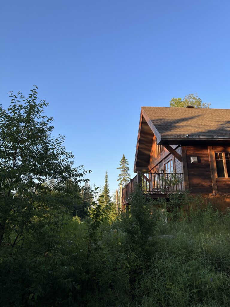 Nous voilà donc en route vers Les Laurentides, région de petite montagne, avec des lacs et de la forêt. Comme 99,999% du Québec. On s’arrête en dessous du Mont Tremblant à côté de la petite ville de St Donat, au nord de … Sainte Adèle, mais oui. Je ne peux rien vous dire de la route, j’ai roupillé comme un sonneur. Oui, je sais comment dormir. C’est juste que des fois, je ne veux pas. Bref, on arrive dans le chalet, trois étages, magnifique, des trucs à attraper de partout. Vous auriez dû voir la tête de mes parents quand ils ont vu les escaliers. Ils ont barricadé le tout, bande de peureux. Des amis nous ont rejoint, mais c’était beaucoup d’émotion, alors je suis partis me coucher en toute grâce, la tête écrasée dans le matelas, les fesses en l’air et une tétine dans chaque main.