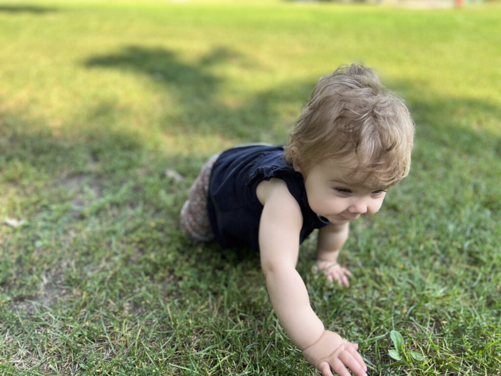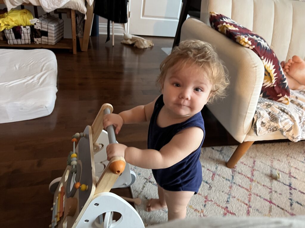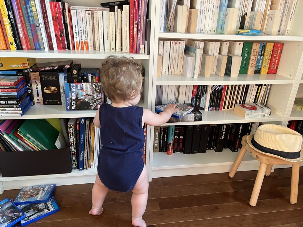 Ah, je marche en déambulateur aussi. Je pousse mon petit chariot de jeu dans tout l’appartement. Je sais ouvrir et fermer les portes de placard, jouer avec les interrupteurs et faire « Jour / Nuit / Jour / Nuit » sans me lasser. J’essaie d’enfiler mes chaussettes et chaussures toute seule (mais c’est encore un peu difficile). Je fais des blagues: j’enfile mon pantalon sur la tête et ça fait rire mes parents. Alors je le fais tout le temps. Je sais empiler mes cubes, mais j’aime surtout les ranger par taille décroissante. Et attention, il faut respecter l’ordre, sinon je recommence tout le tri depuis le début, pour ça je fais preuve d’une patience infinie. Pour la première fois, aujourd’hui j’ai utilisé trois « mots »: mamamamamamama avec la main à la bouche quand j’ai faim, maman-maman-maman quand j’ai besoin de la grande à cheveux longs et papapapapapapapapa quand j’ai besoin d’un câlin ou d’aller me coucher.