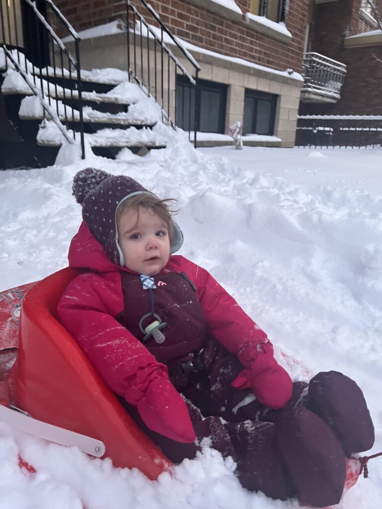Mais dis donc, ça fait un sacré moment qu’on ne s’est pas parlé ! J’en suis désolée car j’ai vraiment beaucoup de choses à vous raconter. Par exemple, ça y est la neige de janvier est vraiment restée. Il a fallu que j’apprenne à me déplacer autrement. La petite poussette toute fragile n’a pas aimé prendre les bancs de neige. Vous auriez dû voir mon père arcbouté derrière, soufflant comme un bœuf, poussant, poussant. Pour 10 centimètres. Bravo champion, plus que 800 mètres comme ça et on y est à la garderie. Bref. Heureusement, j’ai une mère avec plus que deux neurones et demie, qui m’a trouvé un traineau. D’un coup, ça va beaucoup plus vite. Par contre, on va pas se mentir, le petit flocon qui descend dans ton cou, ou l’espèce de mistral qui te balance la neige en plein dans la tronche, ça j’aime beaucoup moins. Et quand j’aime pas, je le fais savoir.