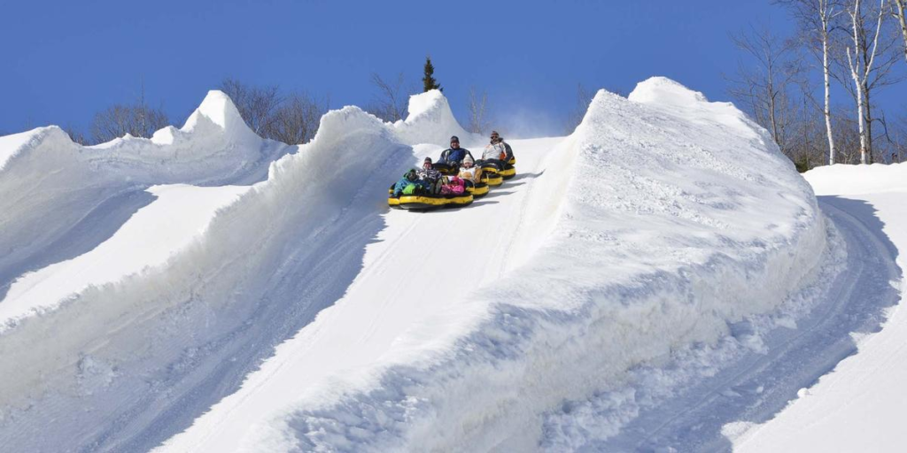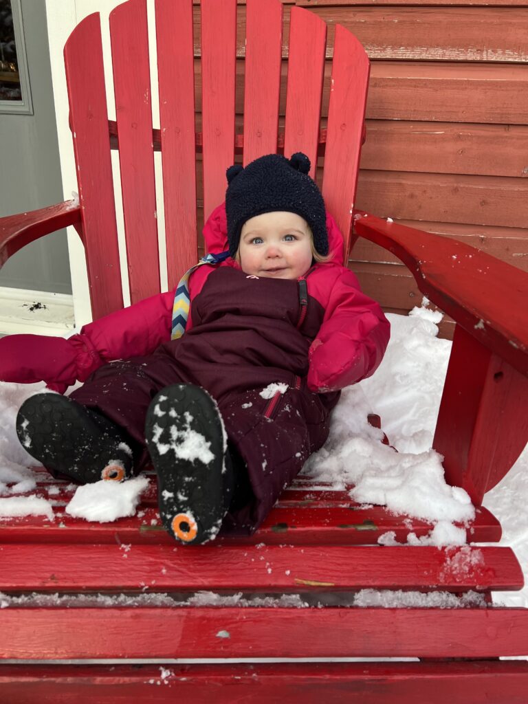 Malgré tout, ils ne m’ont pas totalement oubliée. Un soir, c’est la surprise. Alors que je m’attendais à rentrer à la maison comme d’habitude, et bien non. On me arnache dans la voiture en direction des Laurentides pour aller au chalet. J’y retrouve une couverture « chaaaaaaaaaaaaaat » (un des mots que je sais dire), on teste la tire (comprendre: un filet de sirop d’érable dans la neige que l’on enroule sur une fourchette) et surtout on essaie les glissades. Cela consiste en une chambre à air lancée du haut d’une montagne. Vous connaissez le Canada ? Bon, et bien les chambres à air, c’est pour 8 personnes. Est-ce que j’ai aimé ? La descente, oui. Surtout quand mon père se mangeait la neige qui volait pour me protéger le visage. La montée en attendant dans le froid, moins.